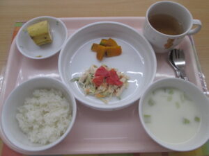 今日の給食は、【ごはん、バンバンジー、焼きかぼちゃ、ミルク中華スープ(チンゲン菜、玉ねぎ)、バナナ】でした。