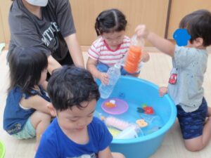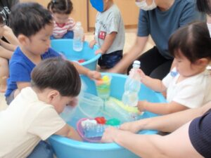 ペットボトルに水鉄砲でちょっとずつ水を入れたり、ダイナミックにコップで移しかえたり、思い思いに楽しみました!