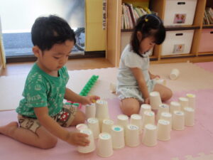 紙コップでは、保育士の真似をして高く積み上げる姿もありました。