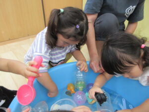 水遊びでは、乗り物や虫の形をしたスポンジがお気に入りで、ペットボトルに入れて蓋をして、