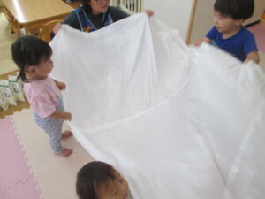 みんなで端っこを持ってバサバサと揺らしたりして楽しんでいましたよ😊🌟