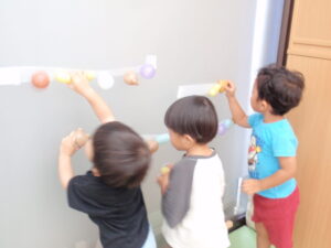 そら組は、窓にテープを貼り、その粘着部分にボールをあてる遊びをしました。