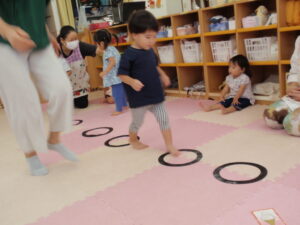 今日は乗り物や自然、ケーキなどのカードを使って丸の所をジャンプしてみたりしました。
