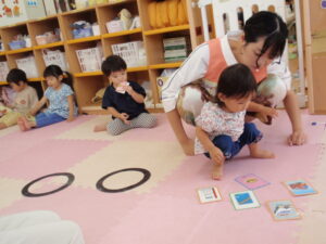 両足ジャンプはまだ難しいお友だちもいますが、好きなカードを選び、じっくりと手元で見ていました😊