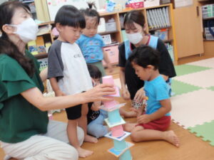 そら組は、ひまわり組よりもバランス良いタワーを作り、なかなか倒れませんでした😊