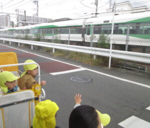 行く途中で珍しいで列車に遭遇!みんなで一生懸命手を振りました