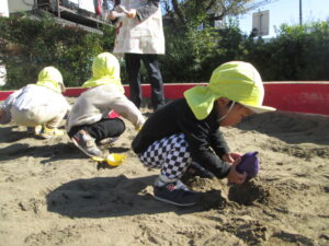 上手にお山を作ったり、カップに砂を入れたり、色んなことにチャレンジする姿が見られました。