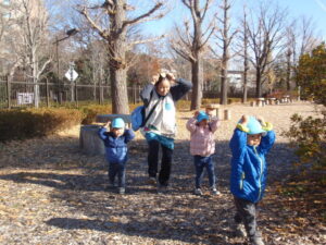 イチョウの落ち葉を鬼の角に見立てて追いかけっこをしました!