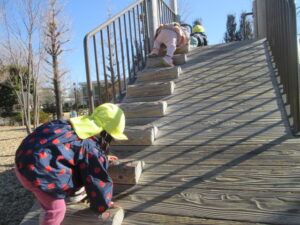 ひとりで勢いよく滑る子、保育士の膝の上に乗って滑る子、後ろ向き慎重に滑る子と色々な滑り方をしていました。