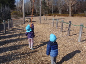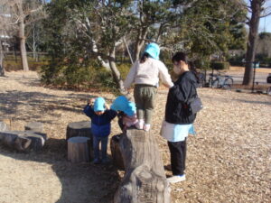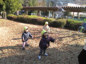 芝生の上でボール遊びをしたり、シャボン玉を追いかけたり、輪っかを使ってケンケンパをしたりして遊びました♪