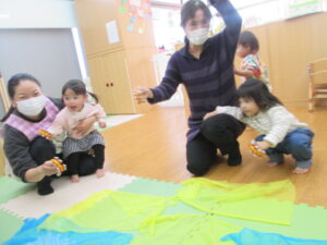 もうすぐ春…ということでスカーフをチューリップに見立てて歌を歌ったり、鈴をじょうろに見立てて水やりをしたりもしました🌷