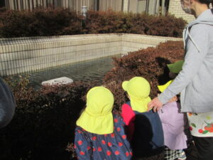 朝おやつの牛乳を飲んだ後は、おやつを持ってクラスごとにお散歩へ出かけました。