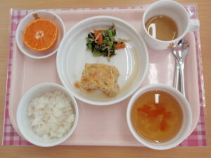 今日の給食は、【ごはん、擬製豆腐、小松菜ともやしのおかか和え、すまし汁(大根、人参)、みかん】でした。