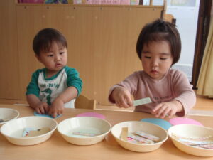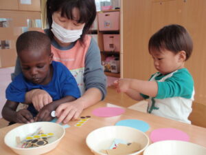そら組です。リトミック前に製作(イースターエッグ)を作りました。