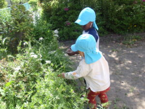 お花や葉に触れたり、タンポポの綿毛を