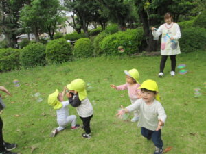 ひまわり組は市民会館へお散歩に行き、ふわふわと空を舞うシャボン玉を一生懸命に追いかけていました🫧