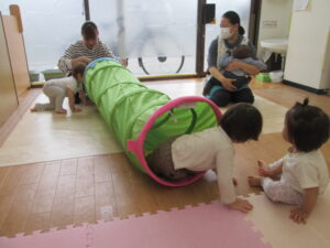 トンネルを最初は怖がっていたお友だちも、他のお友だちが何度も何度も楽しんでいる姿を見て