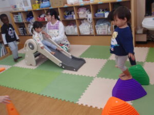 バランスストーンや滑り台を出すとみんな一人でも上手に渡れるようになりました!
