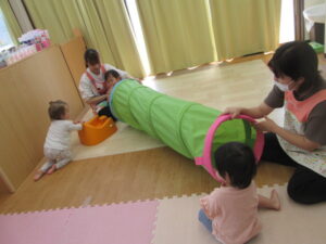 保育園に帰園し、トンネル遊びをしました。