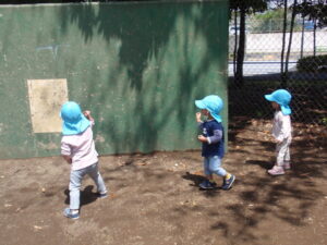 またドングリ拾いをしてから緑色の壁に向かって「おにわーそと!」と掛け声を出して