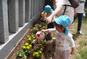 お花を入れて、スコップで土をかけ水をあげました。