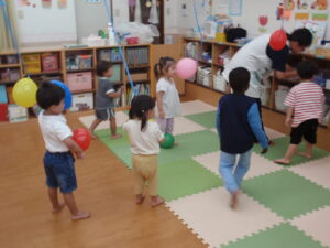 保育士が膨らました風船、口を縛らずに手を離すとビューン!と室内を飛び回りどこかに着地・・「どこに行った~?」と宝探しのようにみんなで探しました🌟