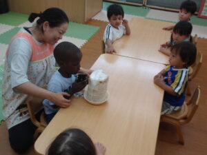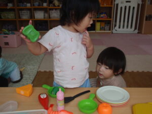 その後ひまわり組さんはおままごとをして遊びました。「どうしようかなー」と色々な食材を手にして選びながら遊んでいました✨