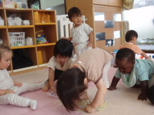 そら組さんは先生がピアノを弾きながらリトミック遊びや、園の中を探検隊!