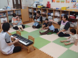 朝のおやつが終わったら、まずはピアノの音に合わせて一人ずつ名前を呼んでいきました。