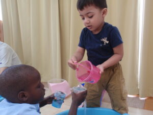 お友だちと協力して水の移し替えを行う姿も・・😁