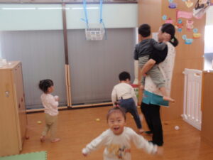 ジャンプして投げ入れたり、「せんせいだっこ~」と抱っこして
