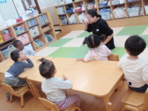 給食前には絵本「だるまさんが」の指人形の