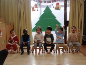一旦部屋に戻り、鈴をもらいみんなで「がんばるぞー、えいえいおー」と気合を入れて、ひまわり組さんの部屋へ移動しました🎄