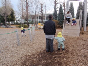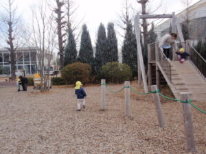 大きなすべり台を何度も滑ったり、ウッドチップに丸い穴が開いている物を何個も見つけたり、