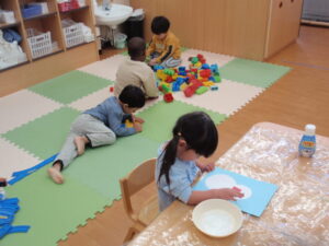 フィンガーペインティングを行い、たくさんの雪を降らせて思い思いの雪だるま製作が出来上がりました!