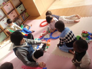 朝の自由遊びの時間には丸く繋げたブロックを道路に見立てて車を走らせていました🚙