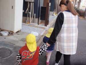 歩ける子は、保育士と手を繋いで歩いて向かいました!