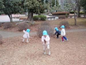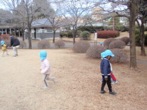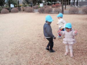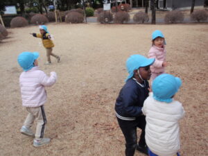 保育士が鬼になると、みんなで逃げたりお友だちに「こっちだよ。」