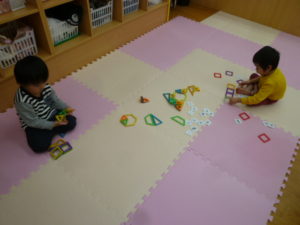 サンタさんからもらった玩具で遊んでいました。マグネットの玩具、