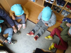 頑張って自分で靴を履いています。