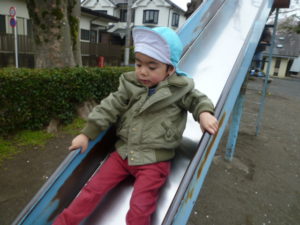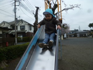 公園に着き大きな滑り台を見つけると大喜びで駆け寄り遊んでいました。