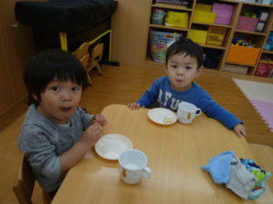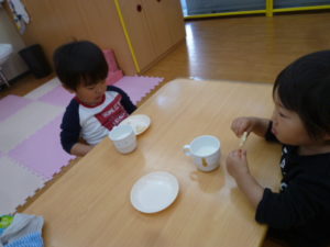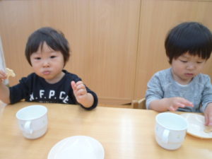 みんなで食べる初めてのおやつです。