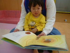 ご飯を食べ終わり、ゆっくりと絵本を見ています。