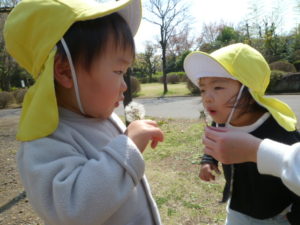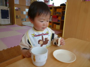 保育者の話しかけに答えたり自分でおやつを食べ、素敵です。
