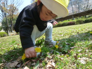 タンポポの綿毛を見つけました。保育者がふぅ~と息を吹きかけ、見せると