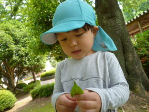 葉っぱが気になり、握ったり保育者が葉っぱに穴を開けると嬉しそうに
