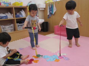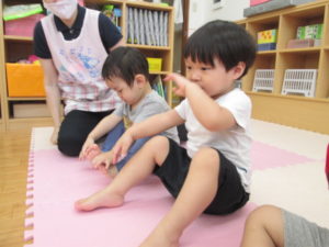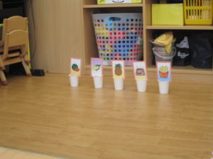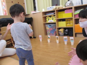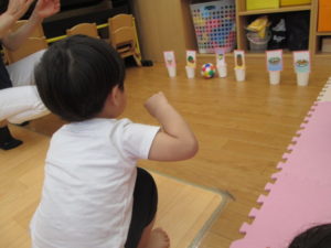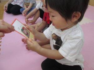 食べ物のカードがもらえて嬉しそうに食べる真似をしていました。