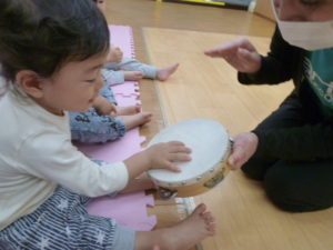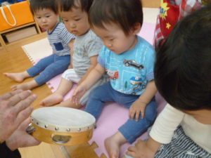 ♪おせんべ焼けたかな♪に合わせてタンバリンを叩いてます。