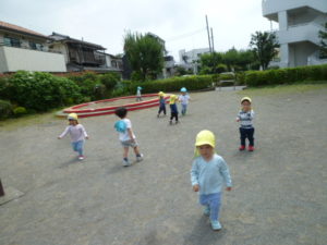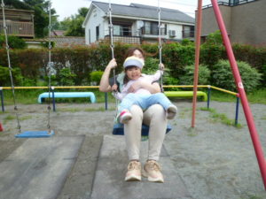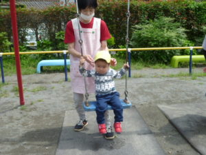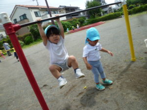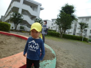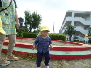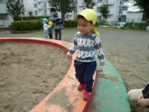 砂場の段差に上がりくるくる回ったり、遊具に乗って楽しむ子どもたちでした。