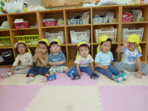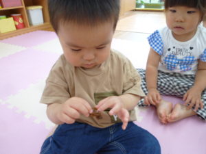 お部屋に戻りみんなでセミの抜け殻を見ると興味津々で見て触る子どもや、